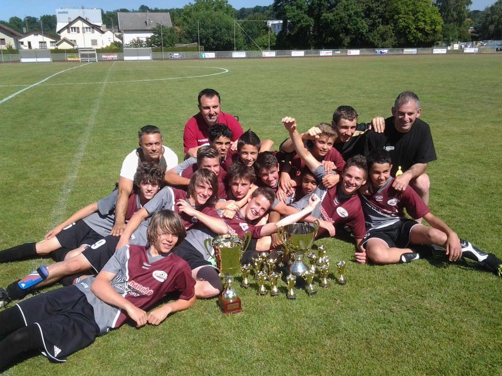 Ils l'ont fait, les U15 ont battus trés largement Arcey en finale du Challenge Beley. L'équipe qui était passée par la petite porte lors de la 1/2 finale (victoire sur tapis vert) n'a laissé aucune chance à son adversaire. L'US Arcey, leader invaincu du groupe élite et qui accède donc au championnat de ligue, nous avais purtant battu 2 fois en championnat, mais samedi c'était une finale, et le groupe était prêt physiquement et mentalement à cet évènement. La causerie d'avant match du coach fut simple,"ils nous ont battu deux fois et sont invaincu, aujourd'hui ils perdront". Les joueurs ont tout de suite pris le match à leur compte et ils ouvrent le score dés la 1ère minute par Erwann. Arcey égalisera en fin de première période, mais dans la minute suivante Erwann redonne l' avantage à nos couleurs. L'équipe contrôlera toute la deuxième mi-temps, étouffant toutes les tentatives de leurs adversaires et en fin de match Erwann signera un triplé en transformant un pénalty.