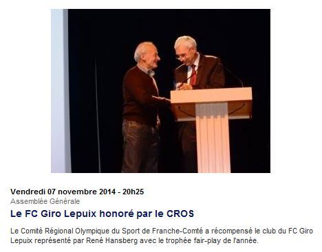 Le FCGL a été doublement récompensé lors des assemblées générales de la ligue et du district des 7 et 8 novembre dernier. A l'AG de la ligue c'est tout d'abord rené Hantzberg qui a reçu le trophée du bénévole de l'année, puis le club a été récompensé pour la troisiéme place de l'équipe fanion au fair-play. Le lendemain à l'AG du district, le club c'est vu récompensé pour son travail sur les équipes de filles et l'équipe réserve du club pour son fair-play. Ces multiples récompenses et reconnaissances mettent en avant tout le travail effectué au sein du club par les entraineurs, éducateurs, dirigeants et bénévoles. Encore merci et bravo à eux