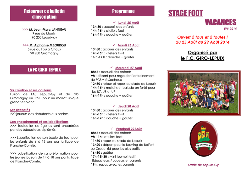 Le stage foot de début de saison se déroulera du 25 au 29 aout pour les enfants de 6 à 13 ans licenciés ou non, vous trouverez le programme ainsi que le bulletin d'inscription à remplir et à retourner au club (girolepuix.foot@wanadoo.fr) ou par téléphone.