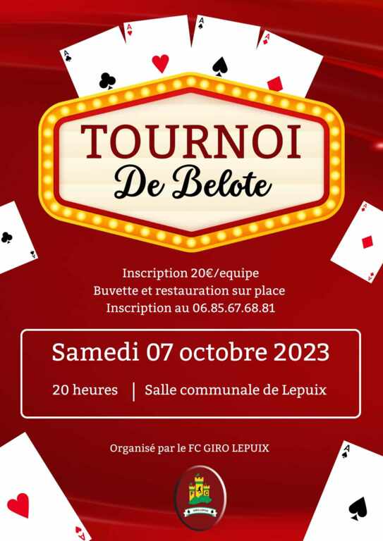 C'est le retour du tournoi de Belote organisé par le FC Giro-Lepuix. Le tournoi aura lieu le Samedi 07 Octobre 2023 à 20h à la salle communale de Lepuix.