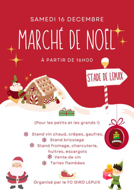 S'en suivra le marché de Noël en extérieur où des stands de dégustation (tartes flambées, crêpes/gaufres, charcuterie/fromage, huitres/escargots et vins) et de bricolage feront le bonheur des petits comme des grands. Je n'oublie pas non plus la boutique du FCGL qui sera également de la partie.