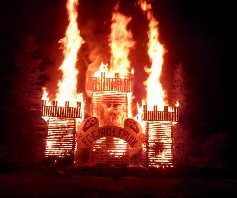 Magique, ils le sont toujours ces édifices que l'on regarde bruler dans la nuit sur le magnifique site du stade des prés du feu. Cette année Thierry Clément et Stephane demeusy ont décidé de reproduire les trois tours qui forment une partie du logo du FCGL. Grâce à l'aide des joueurs séniors et U18 ainsi que des dirigeants éducateurs du club et des bénévoles, ils l'ont construit en moins d'un mois. Et c'est donc le soir de la fête de la musique, après le traditionnel tournoi de sixte du début d'après-midi ou une quinzaine d'équipes y participaient, tel que les grouilles, les farfadets, les tics, les tacs, les skyman.... ont joués au football dans un superbe esprit de camaraderie. Et après le défilé des enfants torches, l'édifice c'est embrasé devant plus d'un millier de spectateurs. Il a brulé toute la nuit, pendant que l'on dansait sous le chapiteau géant.