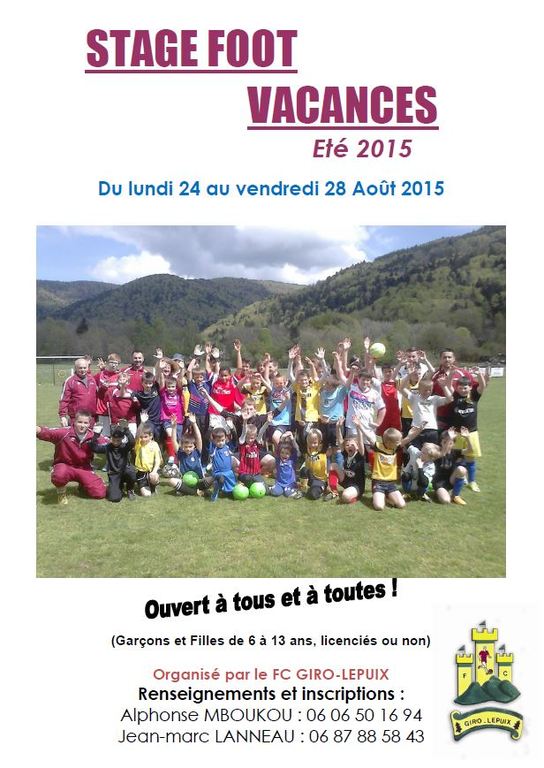Le stage foot du FC Giro-Lepuix se déroulera du 24 au 28 aout sur le site des prés du feu de Lepuix. Pour vous inscrire, télécharger le bulletin d'inscription et renvoyer le une fois rempli au responsables du stage ou par mail à fcgirolepuix.foot@wanadoo.fr