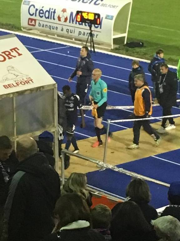 A la 70 minutes, le 1er assesseur, se claquait et devait cèder sa place. Hèlas en National il n y a pas de 4ième arbitre. Pour que la rencontre puisse reprendre et aller à son terme, il fallait donc trouver un arbitre. Le speaker de l'ASMB, faisait donc un appel "micro" recherchant un arbitre présent et surtout en possession de sa licence. Joël NIEDHEROFFER, arbitre au FC GIRO-LEPUIX et joueur en équipe C, n'hésita a poser sa candidature qui fut retenu. Après être allé présenter sa licence aux officiels, il fit un cour passage par les vestiaires pour emprunter une tenue d'arbitre, et retourner sur le terrain. Il s'acquita très bien de sa tâche, et en basket s'il vous plait. Gageons qu'a la fin de la rencontre il aura été convié à l'après match dans le carré VIP.