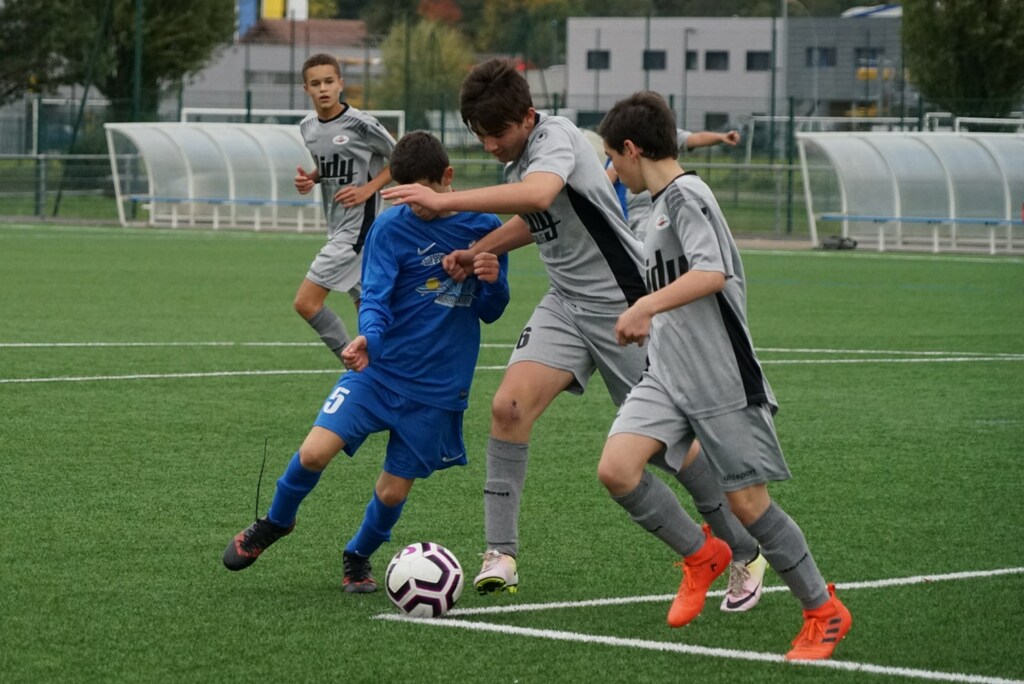Le beau synthétique de Grandvillars permet aux Gris de se détacher rapidement dans cette rencontre, principalement par la qualité technique et la puissance physique de ses milieux de terrain. C’est Elvin qui ouvre le bal à la 7ieme minute de jeu par une belle frappe tendue dans l’axe, sur une passe en retrait de Rayen. La transversale de Grandvillars va trembler longtemps et à de nombreuses reprises pendant les minutes qui suivent avant que Thomas, sur une balle flottante ne trouve enfin le cadre à la 22ième minute. A la 30ième minute, suite à un corner dégagé vers le milieu de terrain, Burak qui passe par là tente sa spéciale et lobe opportunément le gardien sur un tir venu de très loin. Les Bleus qui ne disposent pas de remplaçants subissent largement la domination des Gris et Léo se désole dans ses cages. Les 2 équipes quittent le terrain pour la mi-temps sur le score de 3:0 et on devine que d’autres buts vont arriver en deuxième partie de jeu.